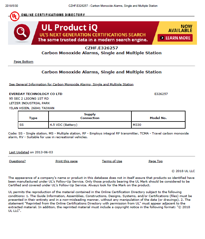 | M330 | AA1.5V battery x 3pcs | 4.5V battery powered CO alarm | UL2034 Listed |